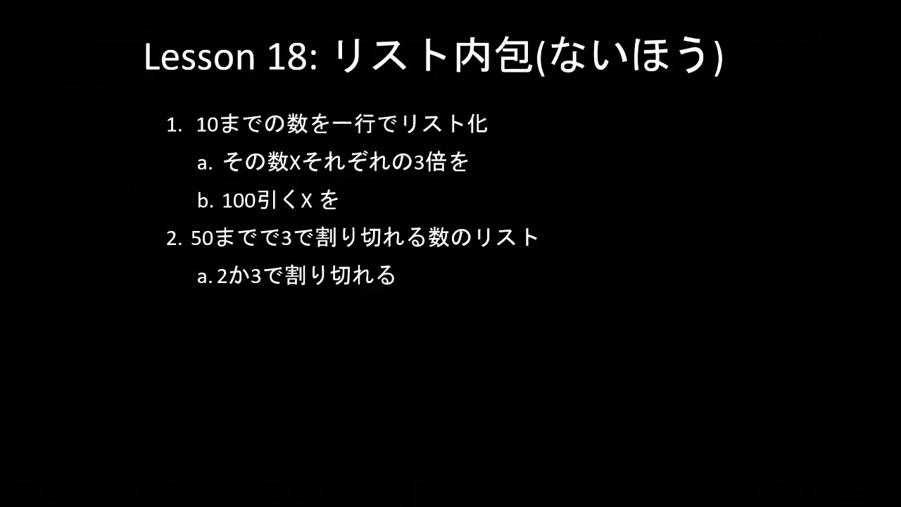 だれでもPython入門編 018回: リスト内包(ないほう)とは 入門 Twitter Facebook はてブ Pocket LINE コピー 2025.02.23 大人にも子どにもプログラミングを楽しんでもらうために、いろいろなPythonプログラミングを解説します。自分でWindowsパソコンで手を動かしながら一緒に勉強しましょう。 第18回では、とっても便利な、「リスト内包」の作り方を説明します。 ★1台のパソコンでこの動画を見ながらColabを動かすには、次を参考にしてください。 https://drive.google.com/file/d/1yYvgMsbu-SQTG6Nq-7jkLDRg_we_m1II/view?usp=sharing
