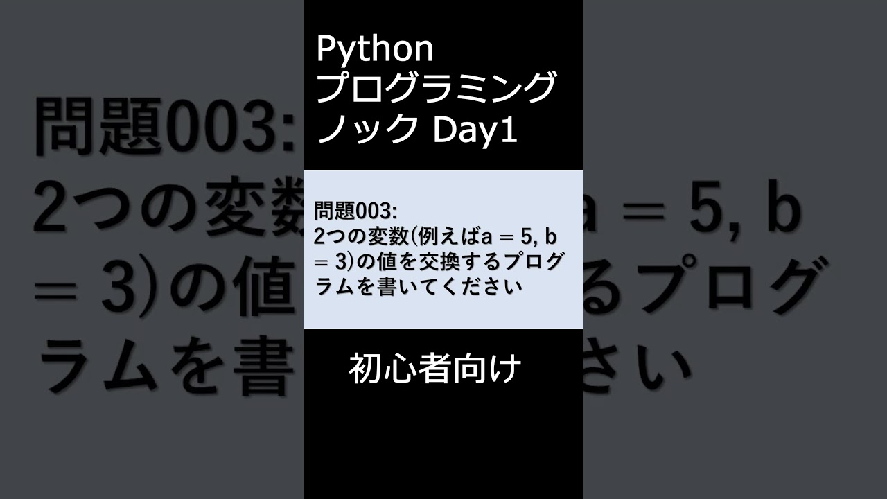 PythonプログラミングノックDay001 初心者向け #プログラミング #python #初心者 初心者 Twitter Facebook はてブ Pocket LINE コピー 2025.03.16 Pythonの正答例は以下になります。 問題001 print(“Hello, World!”) 問題002 a = 5 b = 3 print(a + b) 問題003 a = 5 b = 3 a, b = b, a print(“a:”, a) print(“b:”, b)