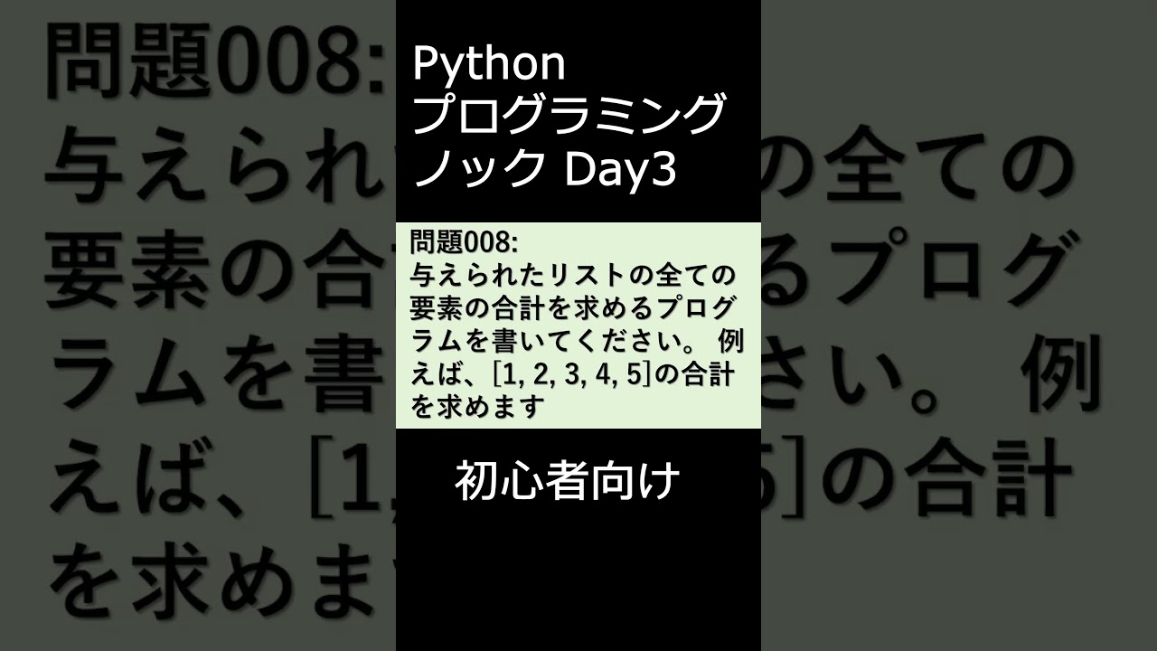 PythonプログラミングノックDay003 初心者向け #プログラミング #python #初心者 初心者 Twitter Facebook はてブ Pocket LINE コピー 2025.03.18 Pythonの正答例は以下になります。 問題007 for i in range(1, 10): for j in range(1, 10): print(i * j, end=”t”) print() 問題008 my_list = [1, 2, 3, 4, 5] print(sum(my_list)) 問題009 text = “hello” print(text[::-1])