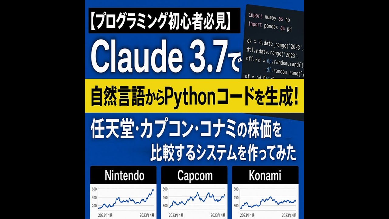 【プログラミング初心者用】Claude 3.7で自然言語からPythonコードを生成!任天堂・カプコン・コナミの株価チャートを比較してみた。※後半、恥ずかしい銘柄(チャート)の読み間違いあり。 初心者 Twitter Facebook はてブ Pocket LINE コピー 2025.05.22 2025.05.21 (訂正ありです。Microsoftより伸びていたのは関電工ではなくAppleでした。 さすがに天下のMicrosoftに勝てる銘柄はAppleでした。 チャートの色がピンク色と赤色で似ていたため、完全に見間違えでした。) 前回に続いてVScodeに接続したclaudeを使ってpythonのプログラミングを自然言語でやっていきます。 株価チャートの比較ツールを自分好みの機能を付けて作ってみました。