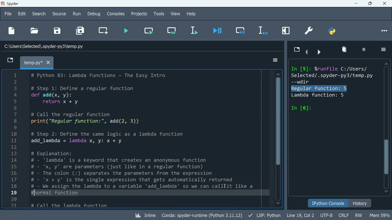 Learn what a lambda function is in Python — and how it’s just like a regular function, but shorter. In this quick video, we compare a normal function with a lambda side by side, explain the syntax, and cover when (and why) you’d use it. Great for Python beginners!