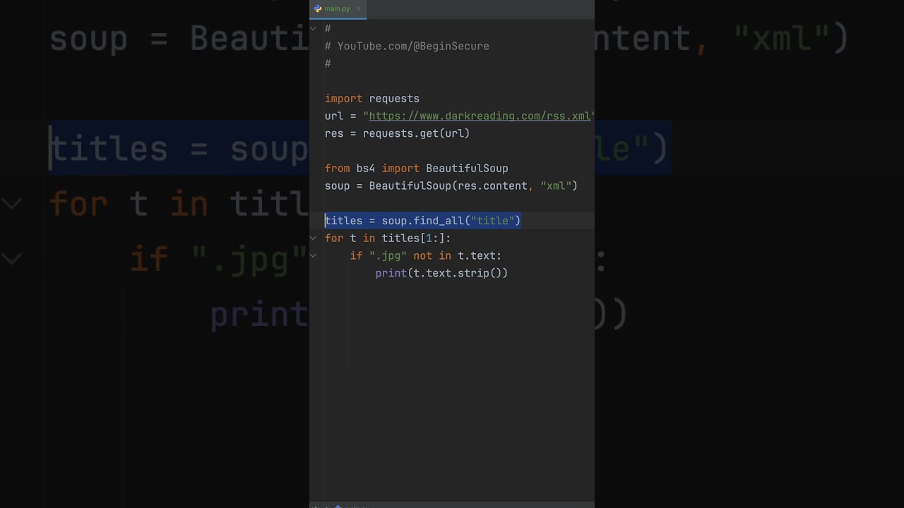 Want to scrape live cybersecurity headlines using Python? In this short, we use requests and BeautifulSoup to fetch and parse the Dark Reading RSS feed in just 6 lines of code.