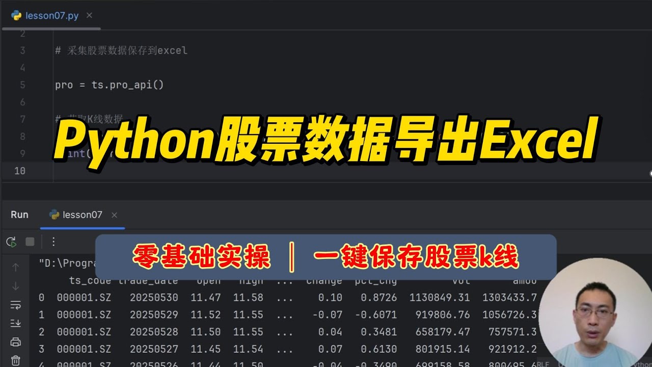 本期视频将手把手教你如何使用Python和Tushare库,轻松获取股票行情数据,并将其保存到本地的Excel文件中。无论你是编程新手、理财爱好者,还是希望自动化管理股票数据,这个教程都能帮你快速上手。视频包含环境配置、代码讲解、数据导出等完整步骤,一看就会。赶快跟着视频一起操作,把你的股市数据玩起来吧!