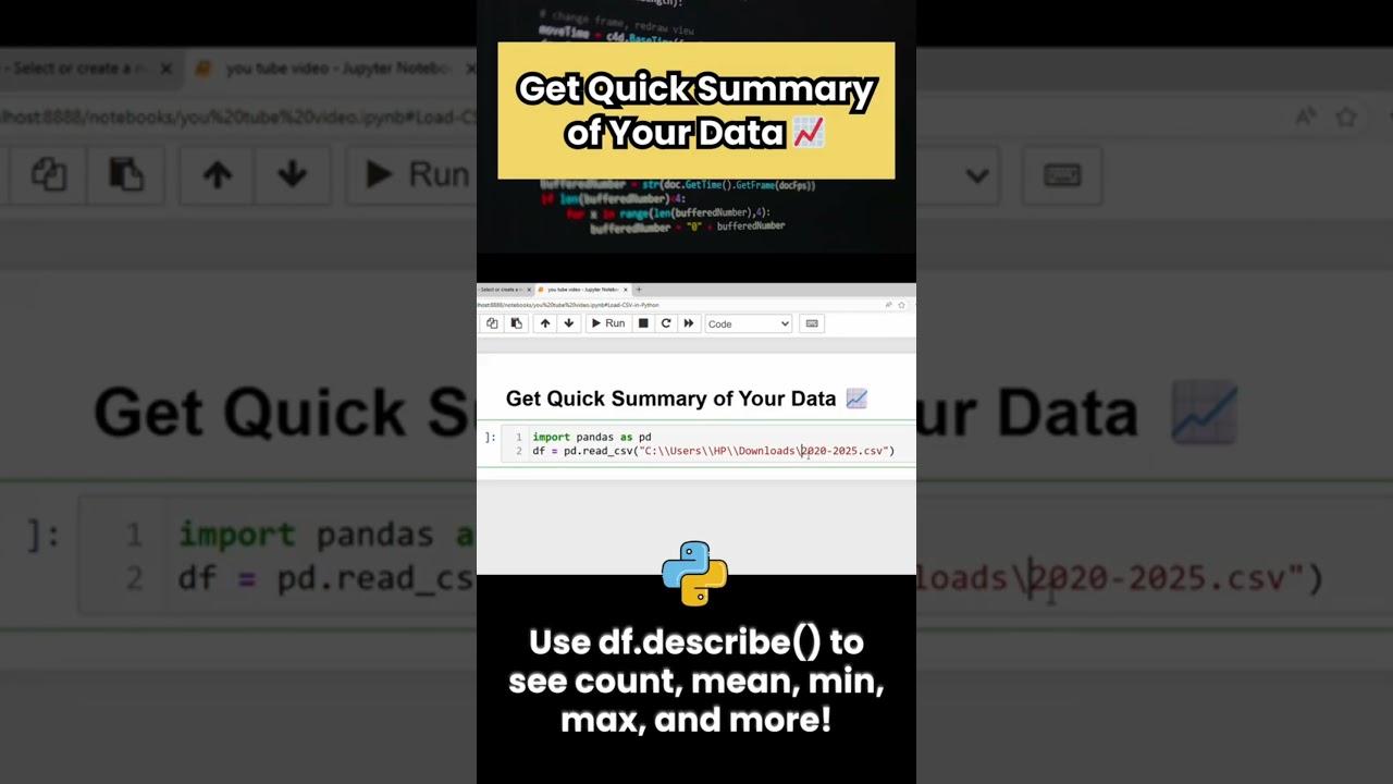 #Python #Pandas #DataAnalysis #DataSummary #PythonForBeginners #LearnPython #DataScience #PythonShorts #DescribeData