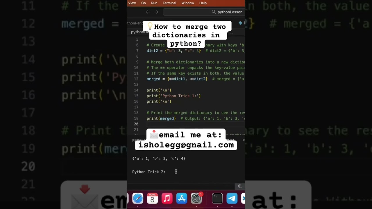 #Python #PythonTricks #MergeDictionariesPython #OneLinePython #CodingTips #ProgrammingHacks #LearnPython #PythonShort #PythonTutorial #TechTips