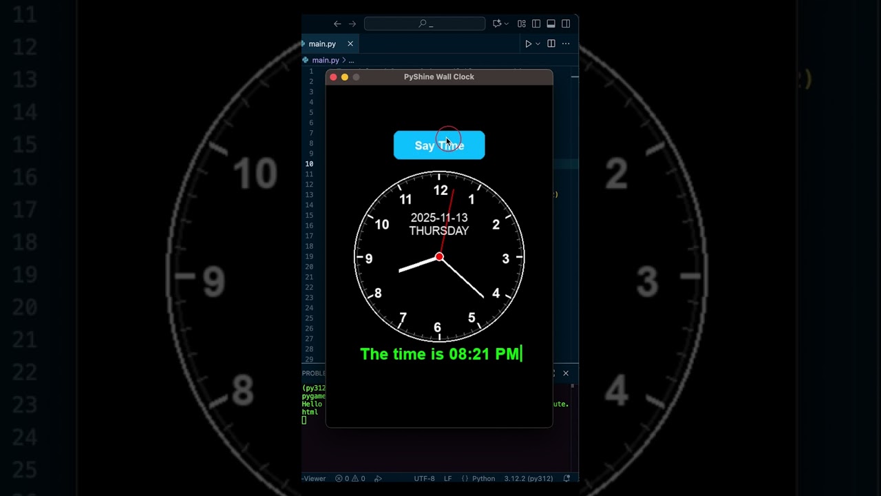 Dear Python Beginners: This video demonstrates output of a simple project by creating a wall clock using Python and Pygame and a button to speak time via TTS or Text-to-Speech. This project is beginner-friendly and helps understand Pygame basics, trigonometry, and working with real-time updates.