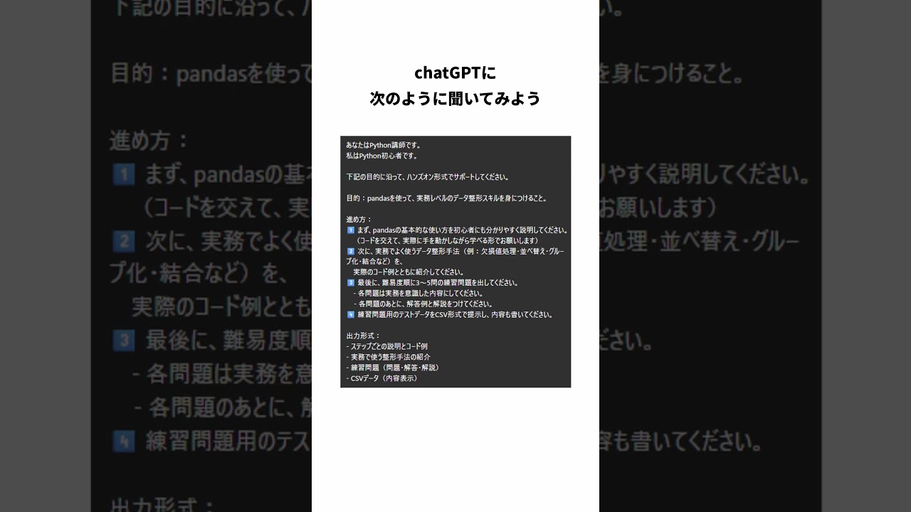 最短で学ぶ!Pythonデータ整形入門 初心者 Twitter Facebook はてブ Pocket LINE コピー 2025.11.30 2025.11.29 この動画では、python初心者の方へ、Pandasを活用した実務レベルのデータ整形スキル習得方法をご紹介しています。